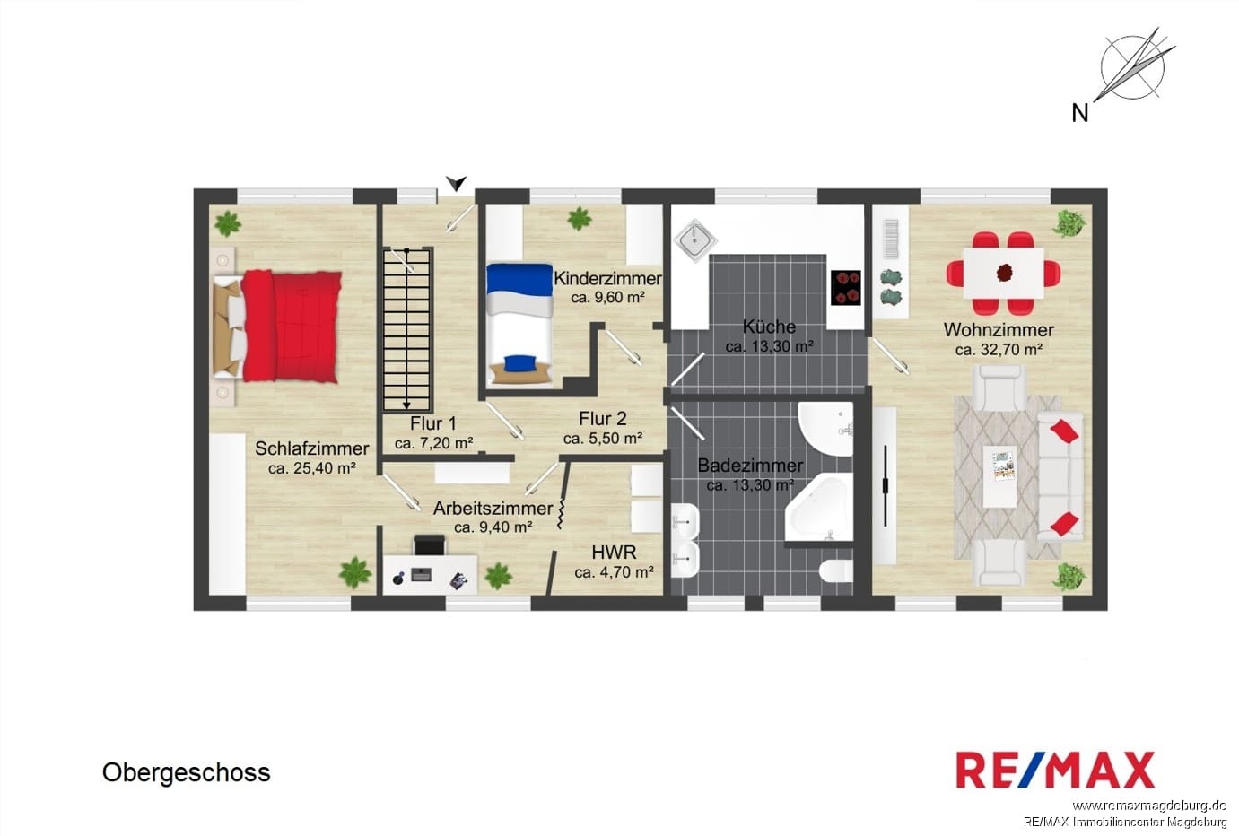 Das Obergeschoss beeindruckt mit einer durchdachten Raumaufteilung und einer hellen, freundlichen Atmosphäre. Ein zentraler Flur verbindet alle Räume und sorgt für kurze Wege im Alltag. Mittelpunkt der Etage ist das großzügige Wohnzimmer, das durch seine offene Gestaltung und große Fensterflächen viel Tageslicht bietet – der perfekte Ort zum Entspannen oder für gesellige Abende. Direkt angrenzend befindet sich die moderne Küche mit ausreichend Platz für kulinarische Aktivitäten und direktem Zugang zum Wohnbereich.