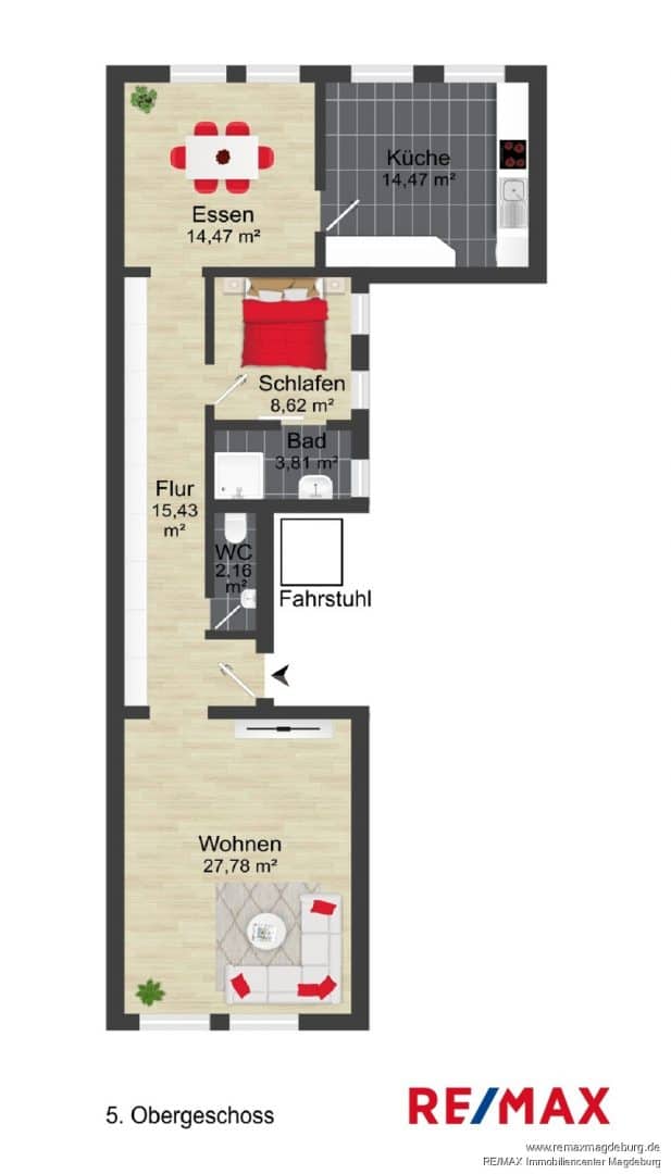 Die 3-R-Wohnung im 5.Obergeschoss ist wie folgt aufgeteilt: