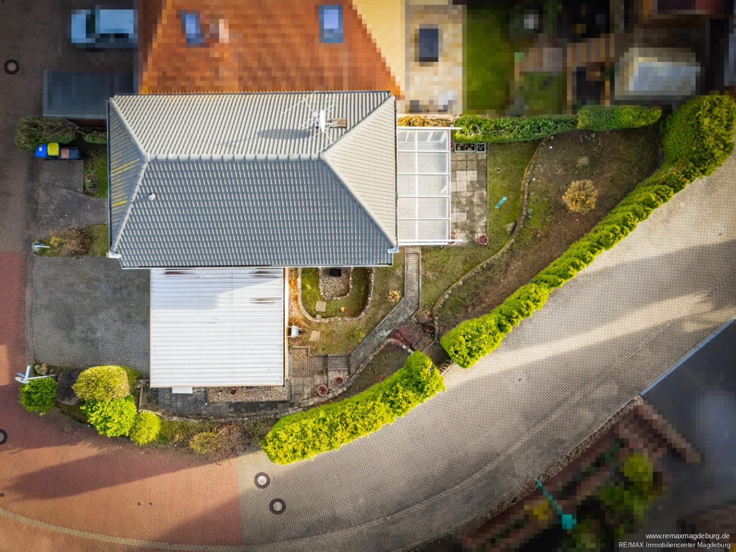 Die Außenanlage überzeugt mit einer praktischen Doppelgarage mit direktem Grundstückszugang, drei Zisternen zur nachhaltigen Wassernutzung sowie einer überdachten Terrasse, die zu jeder Jahreszeit einen gemütlichen Platz im Freien bietet. Das kompakte Grundstück von 361 m² ist angenehm leicht zu pflegen und bietet dennoch genügend Raum für einen Garten, der zum Spielen, Entspannen und Kreativ sein einlädt.