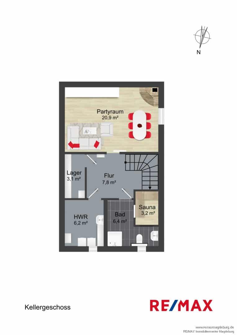 Ein zusätzlicher Lagerraum bietet wertvollen Stauraum. Der angrenzende, behagliche Partyraum hingegen lässt sich flexibel als Gästezimmer oder Hobbyraum nutzen und bietet damit wertvolle zusätzliche Wohnmöglichkeiten. Ein elektrischer Kamin sorgt hier für eine warme und einladende Atmosphäre.