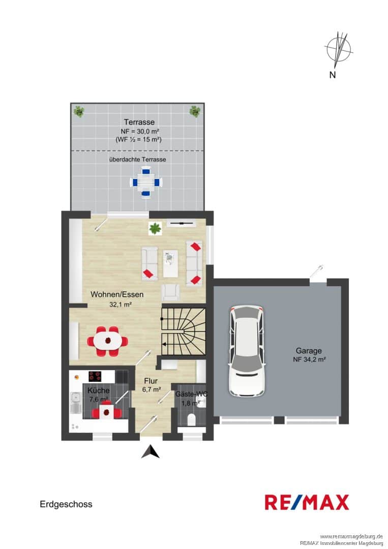 Das Erdgeschoss begrüßt Sie mit einer freundlichen Diele. Von hier aus gelangen Sie in die Küche mit moderner Einbauküche sowie in den offenen Essbereich – ein Ort für Familienmomente, Gespräche und gemeinsame Mahlzeiten. Der angrenzende helle Wohnbereich führt direkt zur überdachten Terrasse und öffnet den Blick ins Grüne. Perfekt für entspannte Abende, Sommerfrühstücke oder gesellige Stunden mit Freunden.