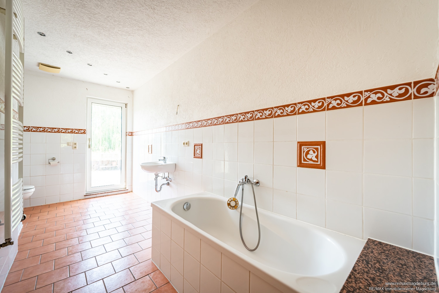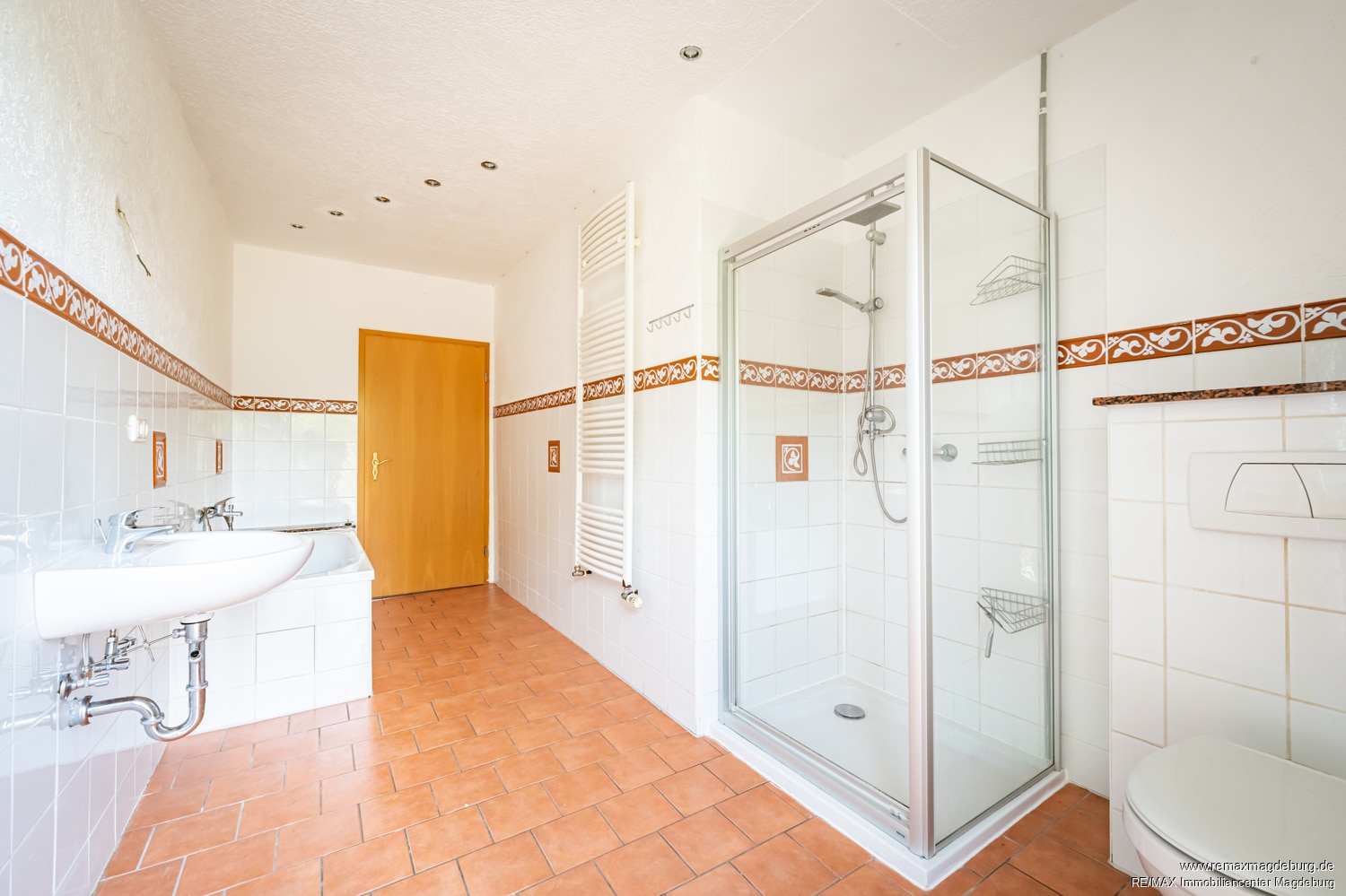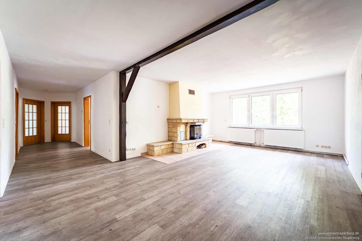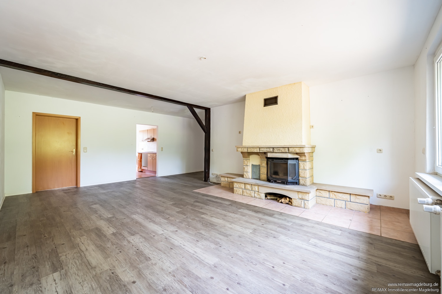 Die rechte Wohneinheit mit etwa 155 m² Wohnfläche eröffnet ebenfalls zahlreiche Nutzungsmöglichkeiten. Ihr Herzstück ist das große Wohnzimmer mit Kamin, das an kühleren Tagen eine warme, einladende Atmosphäre schafft. Das Vollbad sowie die Küche – ausgestattet mit einer Einbauküche – verfügen jeweils über einen Terrassenzugang und sorgen für lichtdurchflutete Wohnbereiche. Vier weitere Zimmer bieten flexible Gestaltungsmöglichkeiten, etwa als Schlaf-, Kinder-, Gäste- oder Arbeitszimmer.
