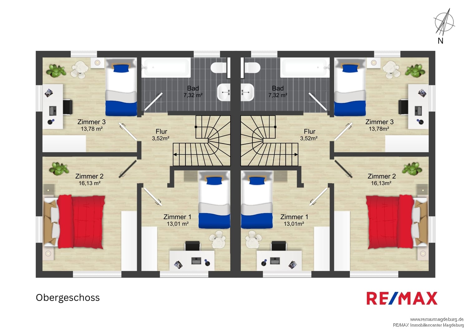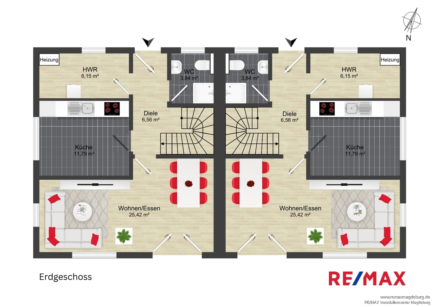 Die hochwertige Ausstattung mit großformatigen Feinsteinzeugfliesen im Erdgeschoss sowie einer eleganten Buchenholztreppe unterstreicht die solide Bauqualität. Beide Wohneinheiten verfügen jeweils über zwei moderne Bäder, was den Wohnwert zusätzlich steigert.