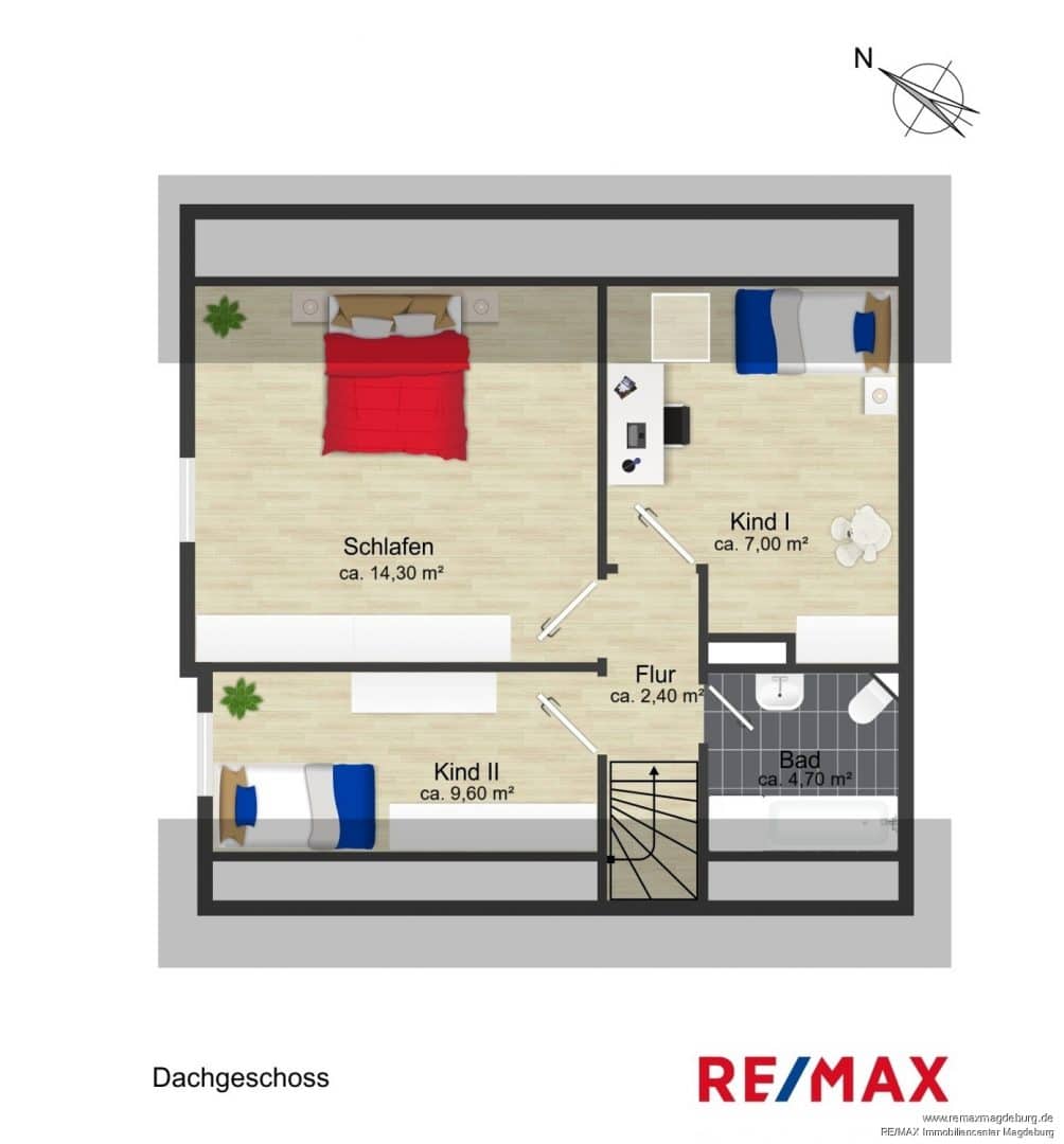 Im Dachgeschoss finden Sie das Schlafzimmer, ein Kinderzimmer sowie ein Arbeitszimmer, ideal für Homeoffice oder Hobbyräume, ergänzt durch ein gepflegtes Badezimmer mit Badewanne.