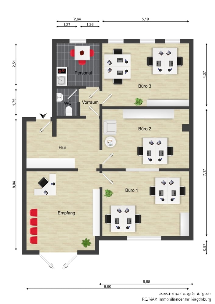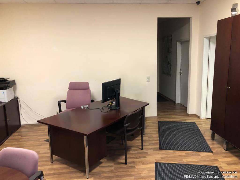 Die aktuell vermietete Bürofläche im Erdgeschoss des Gebäudes erstreckt sich über ca. 106 m² und bietet eine durchdachte, funktionale Raumaufteilung, die für viele Gewerbearten geeignet ist. Die Bürofläche umfasst einen repräsentativen Empfangsraum, drei großzügige Büroräume, einen separaten Personalraum sowie einen Flur, der auch als Lagerraum genutzt werden kann.
