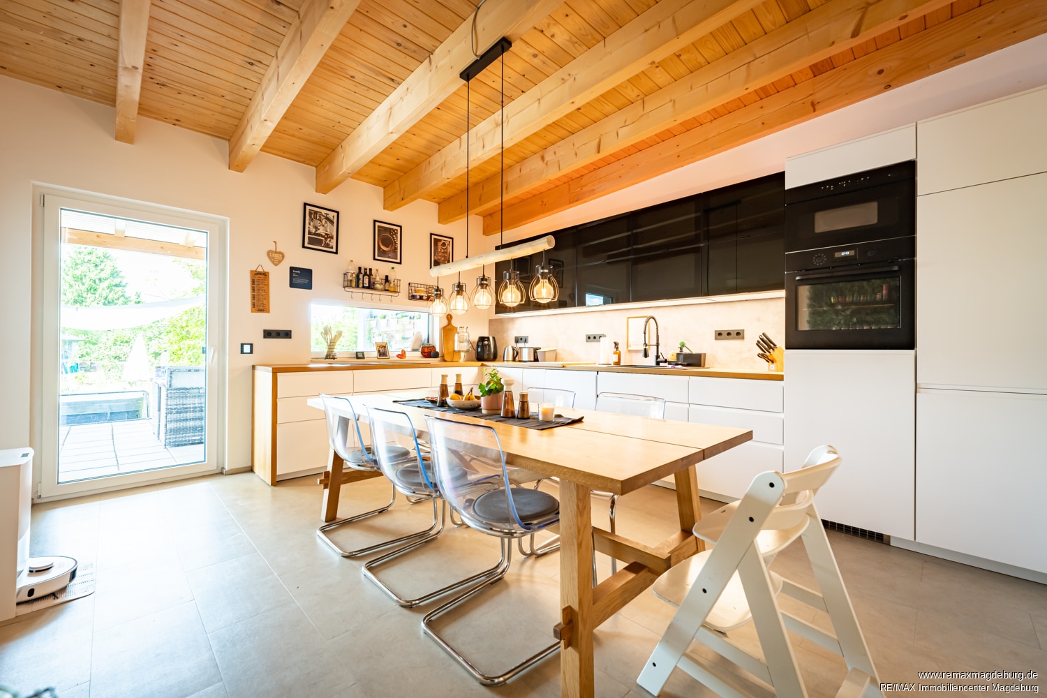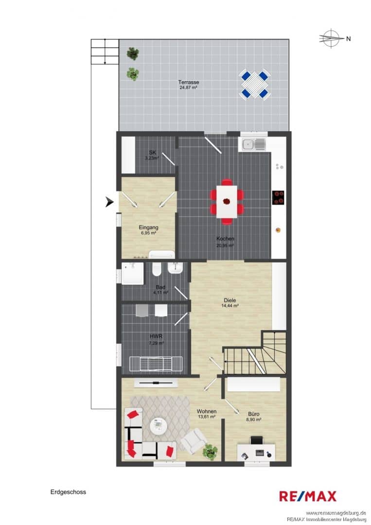 Im Erdgeschoss empfängt Sie ein neu geschaffener Windfang, der direkt in die große Wohnküche führt. Diese bietet nicht nur viel Platz für gemeinsames Kochen und Genießen, sondern auch einen direkten Zugang zur überdachten Terrasse – perfekt für entspannte Mahlzeiten im Freien. Ein praktischer Vorratsraum sorgt für zusätzlichen Stauraum. Ebenfalls im Erdgeschoss befinden sich ein modernes Badezimmer mit Dusche, ein Hauswirtschaftsraum, ein gemütliches Wohnzimmer sowie ein separates Arbeitszimmer, das auch als Gästezimmer genutzt werden kann.