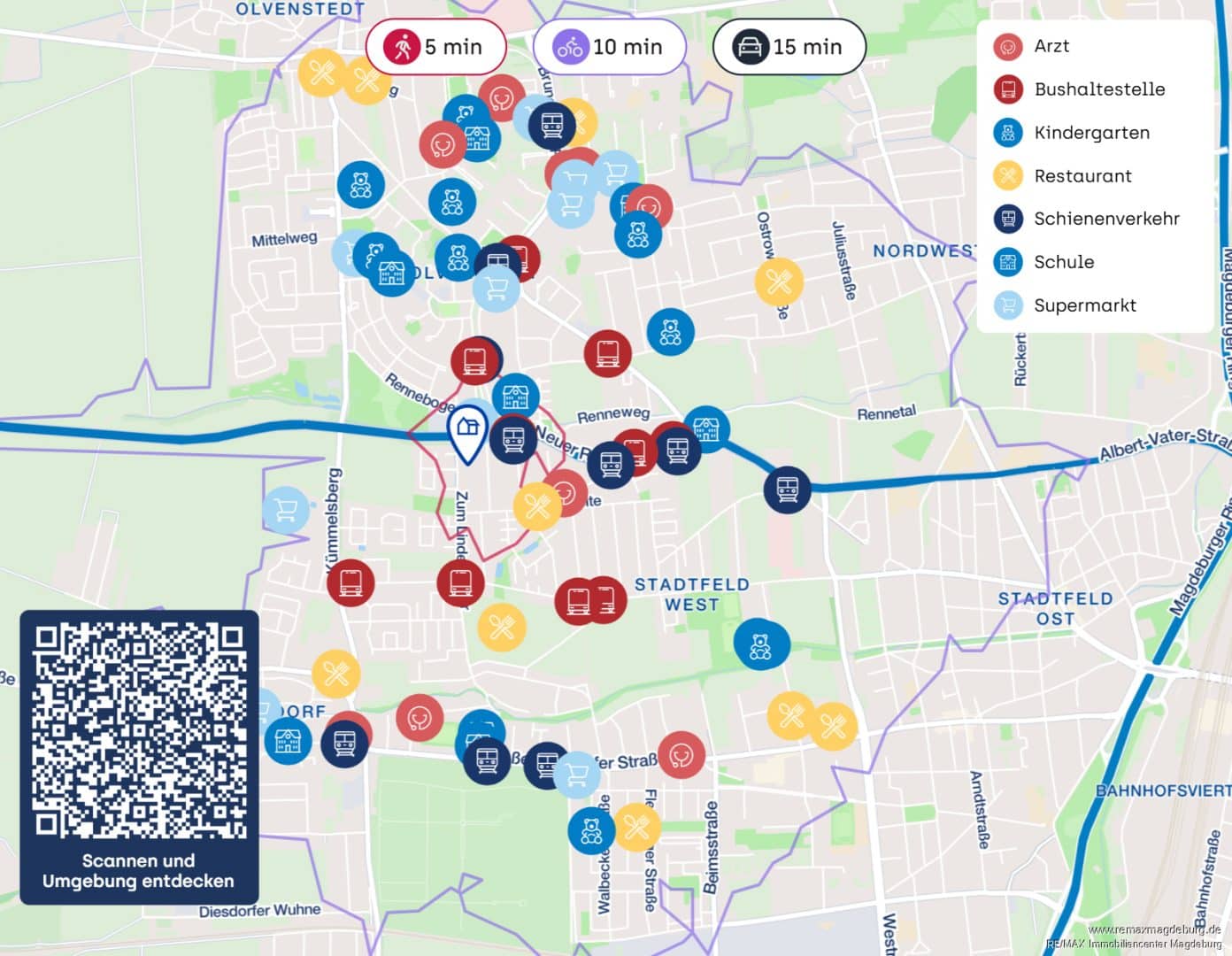 Die Wohnlage überzeugt nicht nur durch ihre idyllische Nachbarschaft, sondern auch durch die Top-Anbindung: Die Innenstadt von Magdeburg ist in wenigen Minuten erreichbar, ebenso wie Schulen, Kindergärten, Einkaufsmöglichkeiten und Ärzte. Dank der hervorragenden Verkehrsanbindung an die A14, A2 und die B1 gelangen Sie zudem schnell und bequem in alle Richtungen – sowohl innerhalb der Stadt als auch überregional.