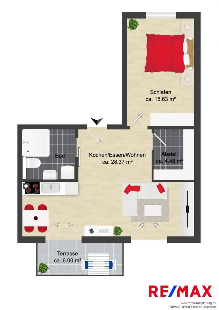 Das Raumangebot umfasst ein separates Schlafzimmer, das Ruhe und Privatsphäre bietet, sowie ein gemütliches Wohnzimmer mit offener Küche, das sich perfekt für gesellige Abende und gemeinsame Mahlzeiten eignet. Der großzügige Abstellraum bietet Ihnen zusätzlichen Stauraum direkt in Ihrer Wohnung. Perfekt geeignet für Haushaltsgeräte, Vorräte oder selten genutzte Gegenstände, sorgt dieser Raum für mehr Ordnung und Struktur in Ihrem Zuhause.