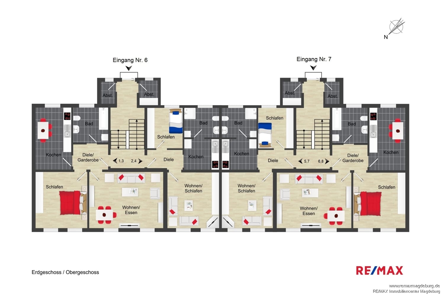 Pro Eingang sind jeweils vier 2-Zimmer-Wohnungen untergebracht, die Wohnflächen zwischen ca. 36 m² und 59 m² umfassen. Jede Wohneinheit verfügt über einen eigenen Abstellraum innerhalb des Hauses. Zusätzlich steht den Mietern jeweils ein weiterer Raum im Nebengelass zur Verfügung. Über das Nebengelass gelangen die Bewohner direkt zu ihrem individuell zugeteilten Gartenabschnitt, was die Attraktivität des Wohnens deutlich erhöht.