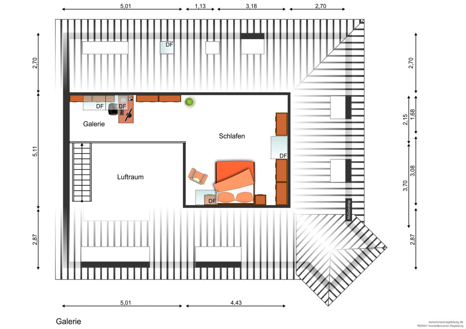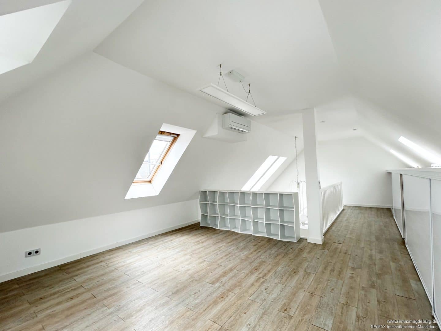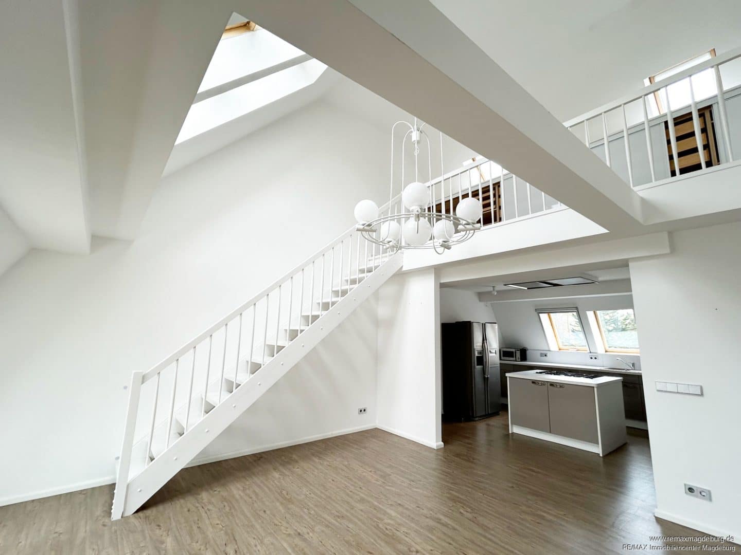 Über die Treppe führt der Weg hinauf zur offenen Galerie – ein vielseitig nutzbarer Bereich, ideal als Homeoffice, Leseecke oder kreative Zone. Auch hier sorgen mehrere Fenster für eine freundliche Atmosphäre.