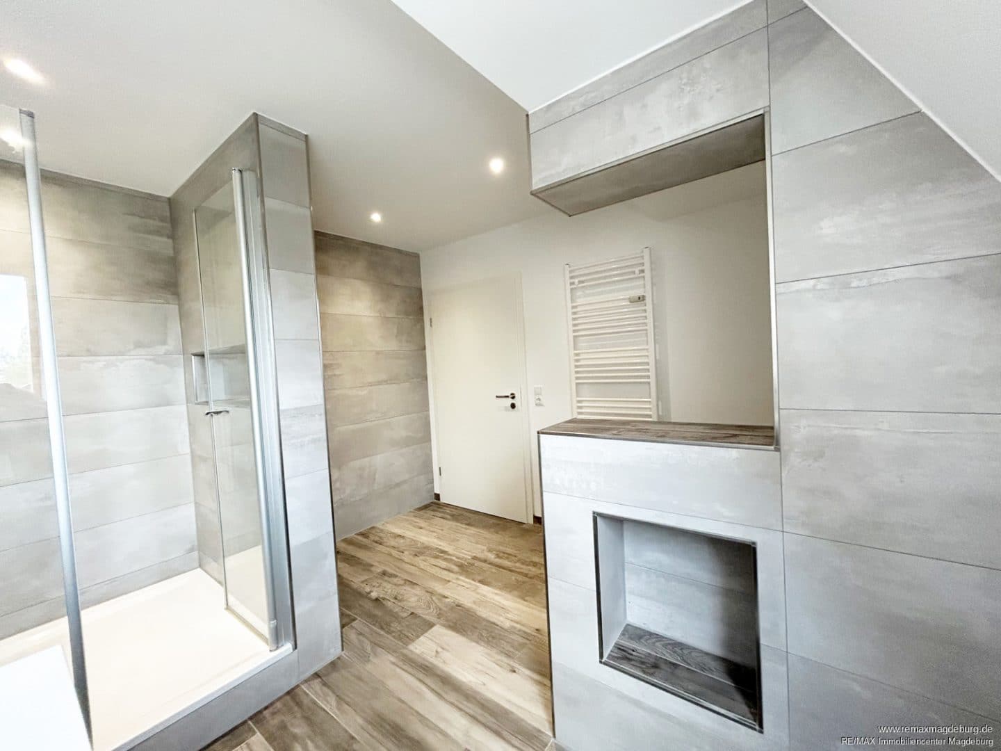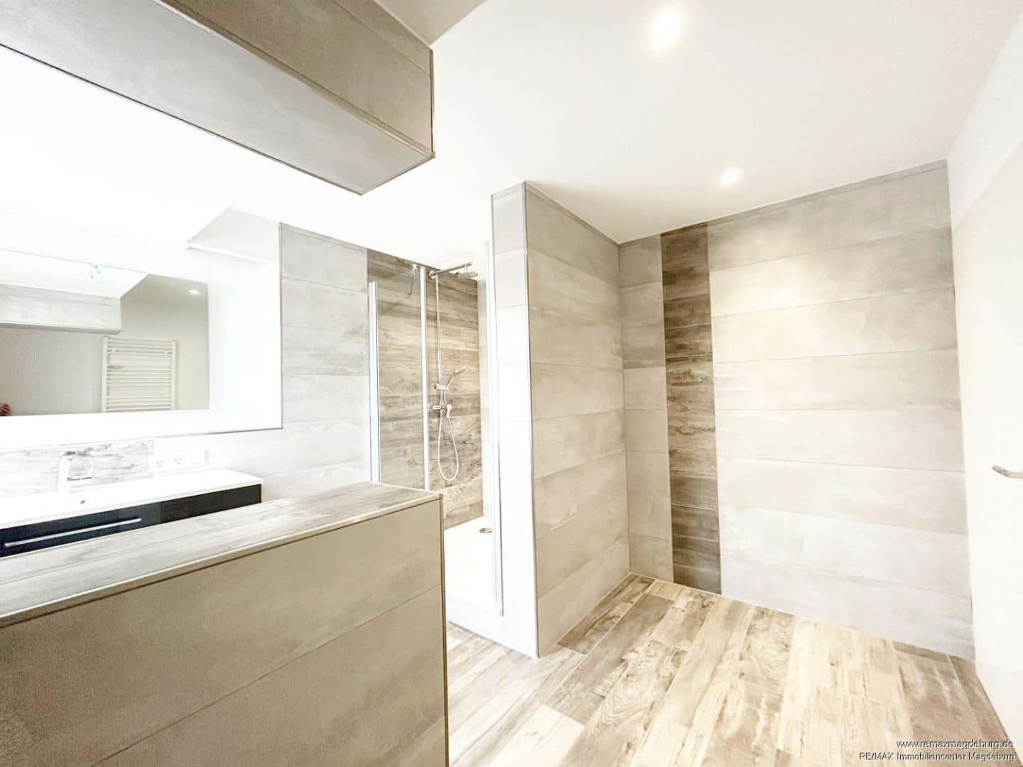 Beim Betreten der Wohnung gelangt man direkt in die moderne Küche, die mit einer stilvollen Kücheninsel und einer hochwertigen Einbauküche ausgestattet ist. Sie bildet das funktionale Herzstück der unteren Ebene und lädt sofort zum Ankommen und Wohlfühlen ein. Direkt angrenzend befindet sich das gepflegte Tageslichtbad, welches über eine große Dusche verfügt.