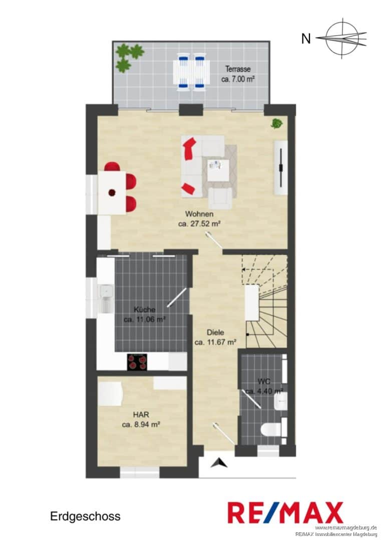 Im Erdgeschoss empfängt Sie eine großzügige Diele mit Platz für eine Garderobe. Direkt angrenzend befindet sich das modern gestaltete Gäste-WC. Der offen konzipierte Wohn- und Essbereich bildet das Herzstück des Hauses und überzeugt durch Helligkeit und eine angenehme Wohnatmosphäre. Von hier aus gelangen Sie direkt auf die Terrasse, die zusätzlichen Raum für entspannte Stunden im Freien bietet.