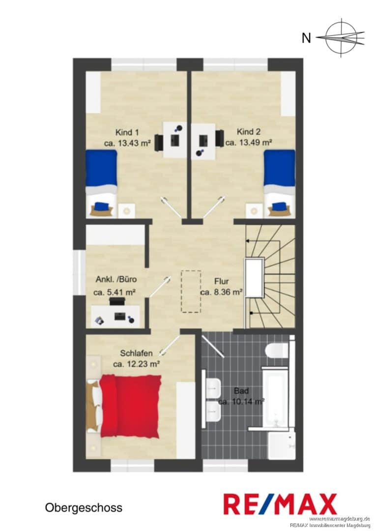 Das Obergeschoss bietet einen idealen Rückzugsbereich. Das großzügige Badezimmer ist modern ausgestattet und verfügt über Badewanne und Dusche. Das Schlafzimmer bietet ausreichend Platz für einen großen Kleiderschrank. Zwei weitere helle Zimmer eignen sich flexibel als Kinder-, Gäste- oder Arbeitszimmer. Ein zusätzlicher Raum kann ideal als Homeoffice oder Ankleide genutzt werden.