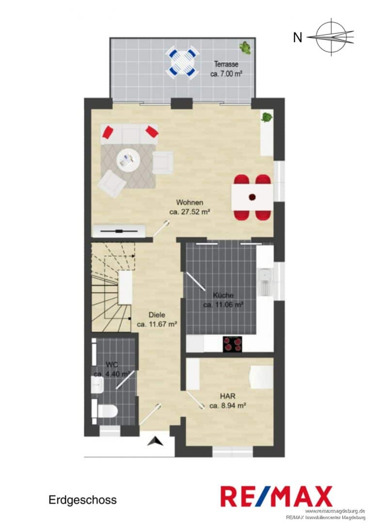 Im Erdgeschoss empfängt Sie eine großzügige Diele mit Platz für eine Garderobe. Direkt angrenzend befindet sich das modern gestaltete Gäste-WC. Der offen konzipierte Wohn- und Essbereich bildet das Herzstück des Hauses und überzeugt durch Helligkeit und eine angenehme Wohnatmosphäre. Von hier aus gelangen Sie direkt auf die Terrasse, die zusätzlichen Raum für entspannte Stunden im Freien bietet.