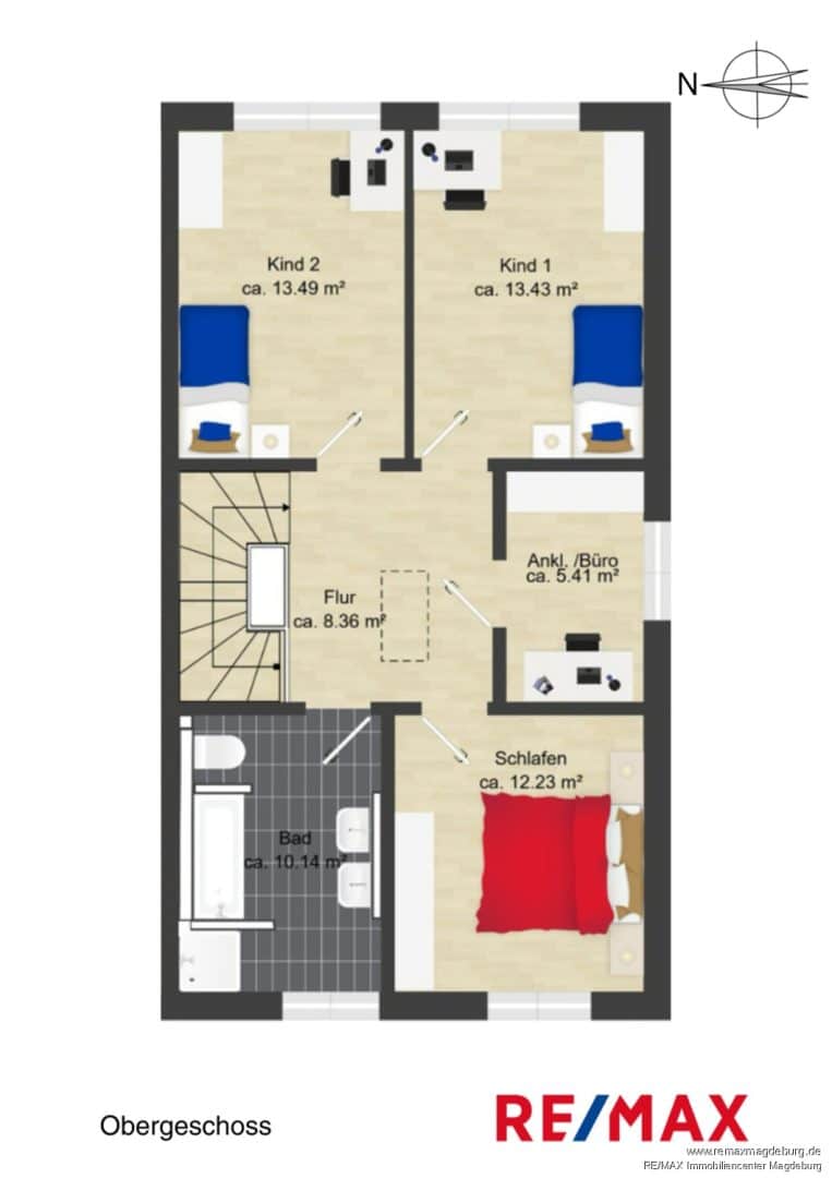 Das Obergeschoss bietet einen idealen Rückzugsbereich. Das großzügige Badezimmer ist modern ausgestattet und verfügt über Badewanne und Dusche. Das Schlafzimmer bietet ausreichend Platz für einen großen Kleiderschrank. Zwei weitere helle Zimmer eignen sich flexibel als Kinder-, Gäste- oder Arbeitszimmer. Ein zusätzlicher Raum kann ideal als Homeoffice oder Ankleide genutzt werden.