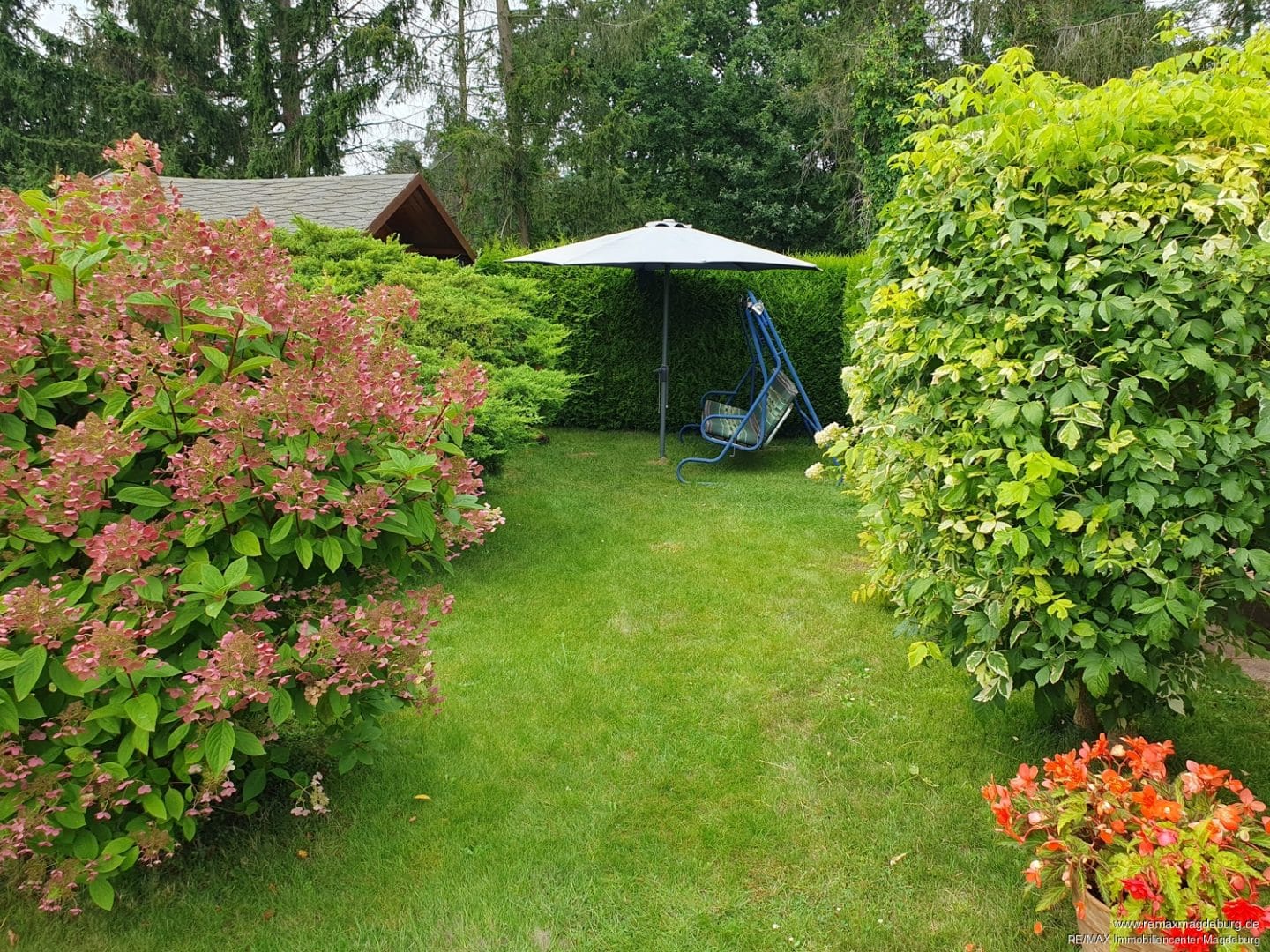 Auf dem geschmackvoll angelegten Grundstück befindet sich ein Carportstellplatz, ein neuwertiges Blockhaus und weitere Unterstellmöglichkeiten.