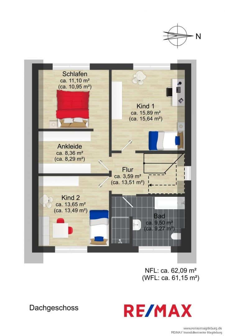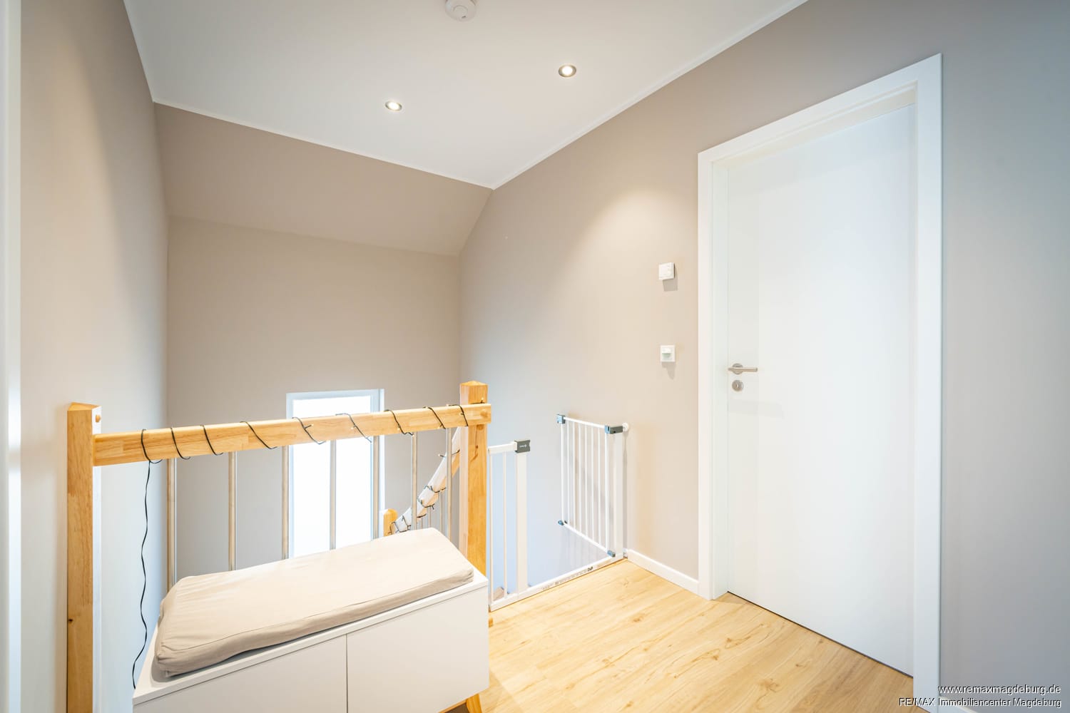 Eine Holztreppe führt ins Dachgeschoss, wo der Komfort seine Fortsetzung findet. In der oberen Etage angekommen, gelangen Sie durch die Galerie in das Masterbad, sowie in das Schlaf-, Kinder- und Arbeitszimmer. Letzteres lässt sich auch sehr gut als zweites Kinderzimmer nutzen. Das Schlafzimmer verfügt über einen separaten Ankleidebereich mit Einbauschränken, welche im Angebotspreis enthalten sind.
