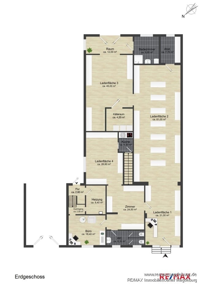 Die großzügige Gewerbeeinheit mit einer Fläche von etwa 275 Quadratmetern eröffnet optimale Voraussetzungen für unterschiedlichste Nutzungskonzepte – ob als Ladenfläche, Praxis, Büro oder Atelier. Die durchdachte Raumaufteilung eignet sich ideal für Einzelhandel, Dienstleistungsunternehmen oder kreative Geschäftsideen. Das Erdgeschoss verfügt über mehrere separate Laden- und Arbeitsbereiche, die flexibel gestaltet und an verschiedenste Bedürfnisse angepasst werden können. Große Fensterflächen sorgen für eine helle, einladende Atmosphäre und bieten ideale Möglichkeiten zur Präsentation.