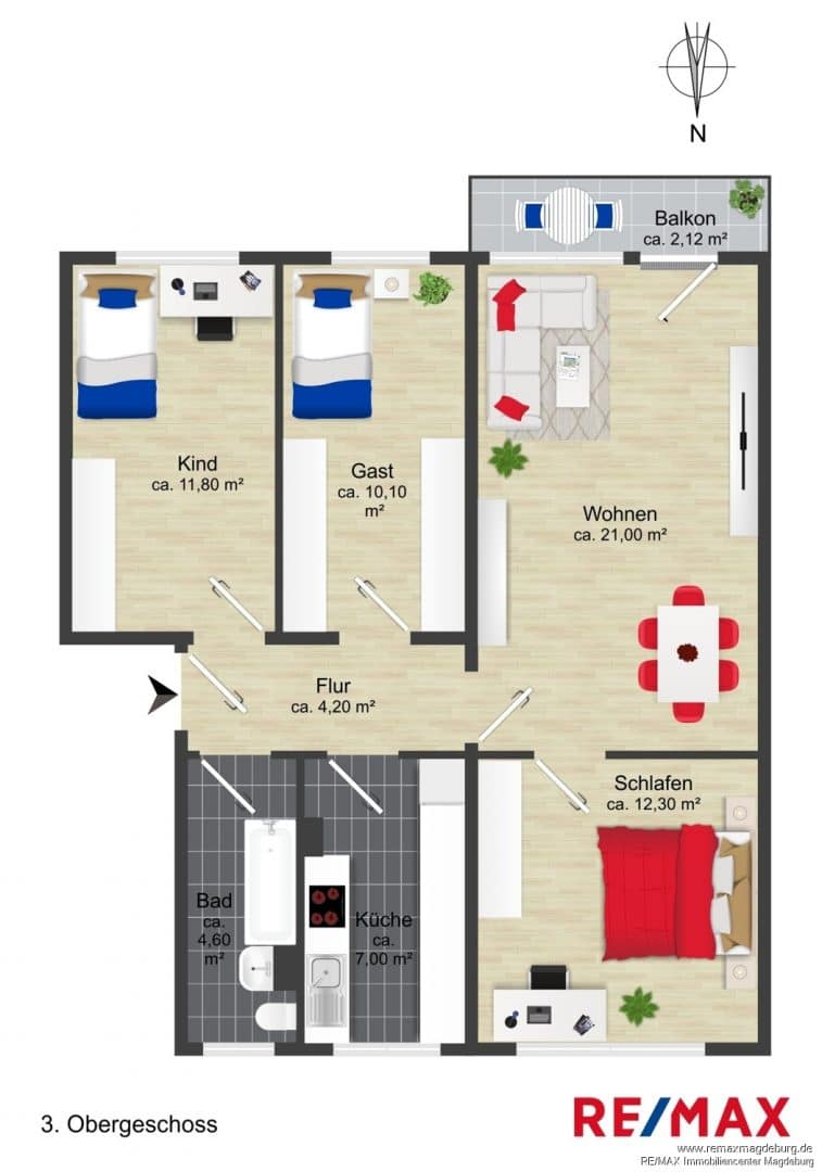 Vom zentral gelegenen Flur aus sind nahezu alle Räume direkt erreichbar. Das Kinderzimmer und das separate Gästezimmer lassen sich flexibel nutzen – beispielsweise als Arbeitsbereich, Hobbyraum oder Rückzugsort für Gäste. Das großzügige Wohnzimmer bildet das Herzstück der Wohnung und bietet ausreichend Platz für einen gemütlichen Wohn- und Essbereich. Von hier aus gelangt man direkt auf den Balkon, der zum Entspannen im Freien einlädt. Angrenzend an das Wohnzimmer befindet sich das Schlafzimmer.