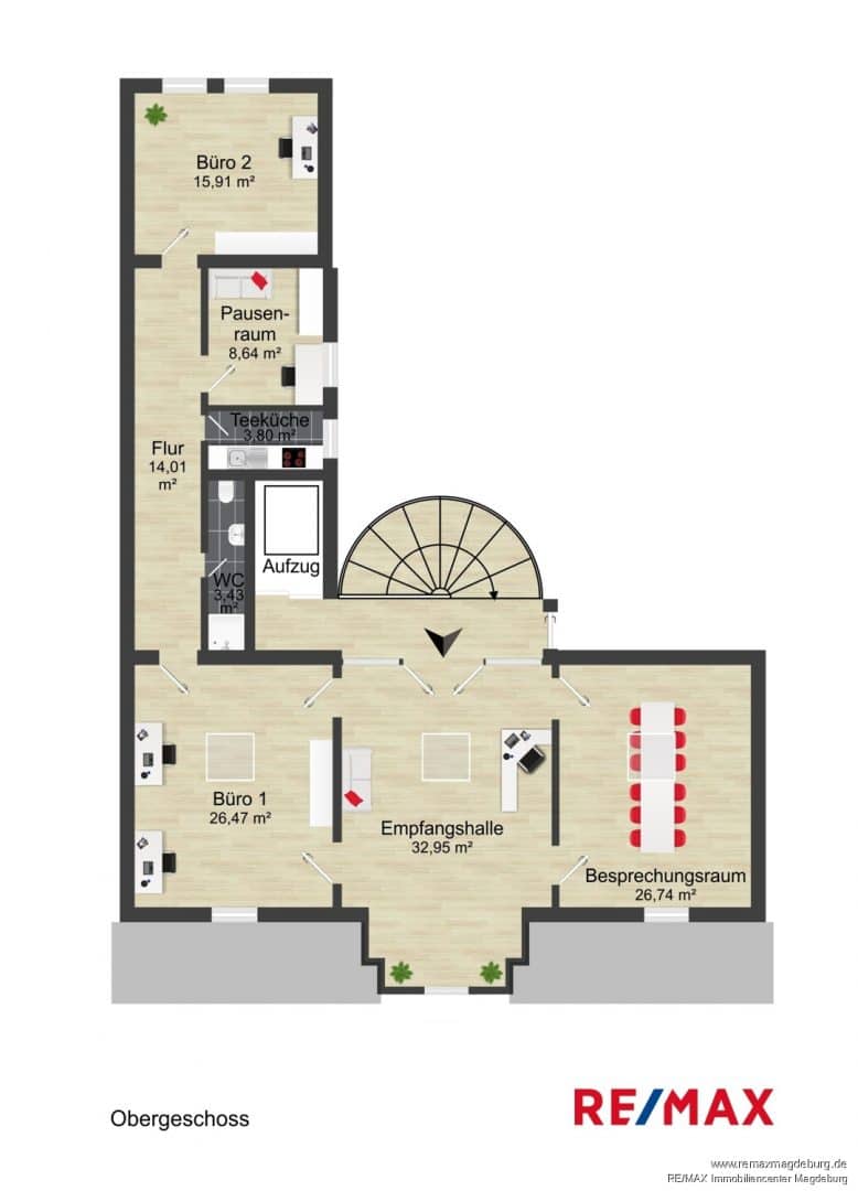Direkt angrenzend befindet sich ein heller Besprechungsraum, der sich ideal für Meetings oder Beratungen eignet. Zwei weitere Büroräume bieten flexible Nutzungsmöglichkeiten – sei es als Einzel- oder Doppelbüro, als Behandlungsraum oder für konzentriertes Arbeiten.