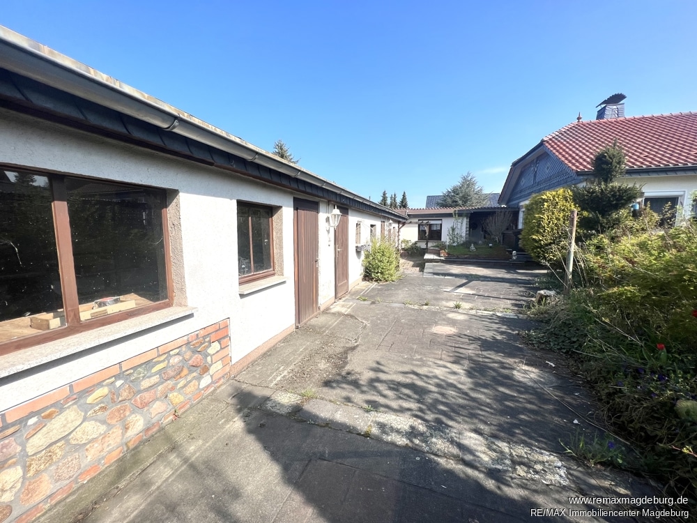 Viel Platz für die Unterbringungen von Fahrzeugen, Lager, Abstellen von Gartengeräten und -möbeln, zum Werkeln und für ein Hobby bietet das Nebengelass, ein Doppelcarport, die Garage, eine Werkstatt und weitere Abstellmöglichkeiten. Mit einigen Umbauten kann das Nebengelass sogar in eine Einliegerwohnung umfunktioniert werden. Es verfügt bereits über zwei Räume mit einer Küche und zwei Toiletten. Ganz nach Geschmack und Notwendigkeit.