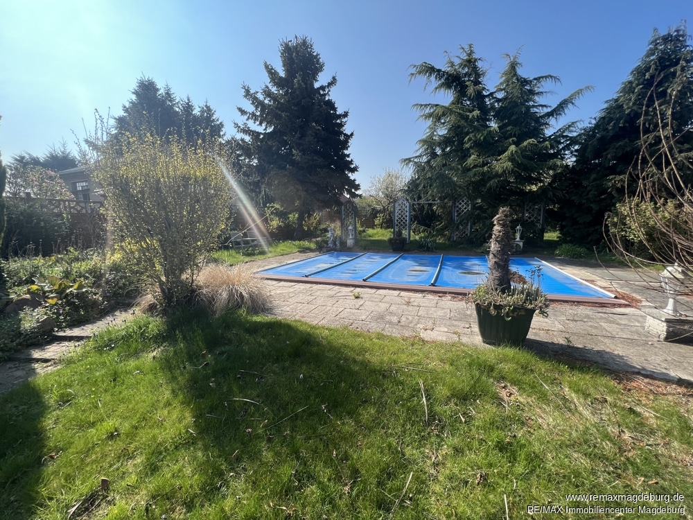 Das Dachgeschoss ist als Wohnraum nicht nutzbar. Das Walmdach wurde auf dem ehemaligen Flachdach aus optischen Gründen aufgebaut und rundet das Erscheinungsbild ab. Das Grundstück ist mit ca. 1.435 m² ein Paradies für Gartenfreunde. Abkühlung und Badespaß verspricht Außenpool in den Sommermonaten.