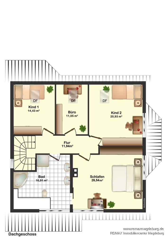 Im Dachgeschoss stehen der Familie vier weitere Zimmer, die als Schlaf-, Kinder- oder Arbeitszimmer genutzt werden können sowie ein großes, lichtdurchflutetes Badezimmer mit Dusche und einer Eckbadewanne zur Verfügung.