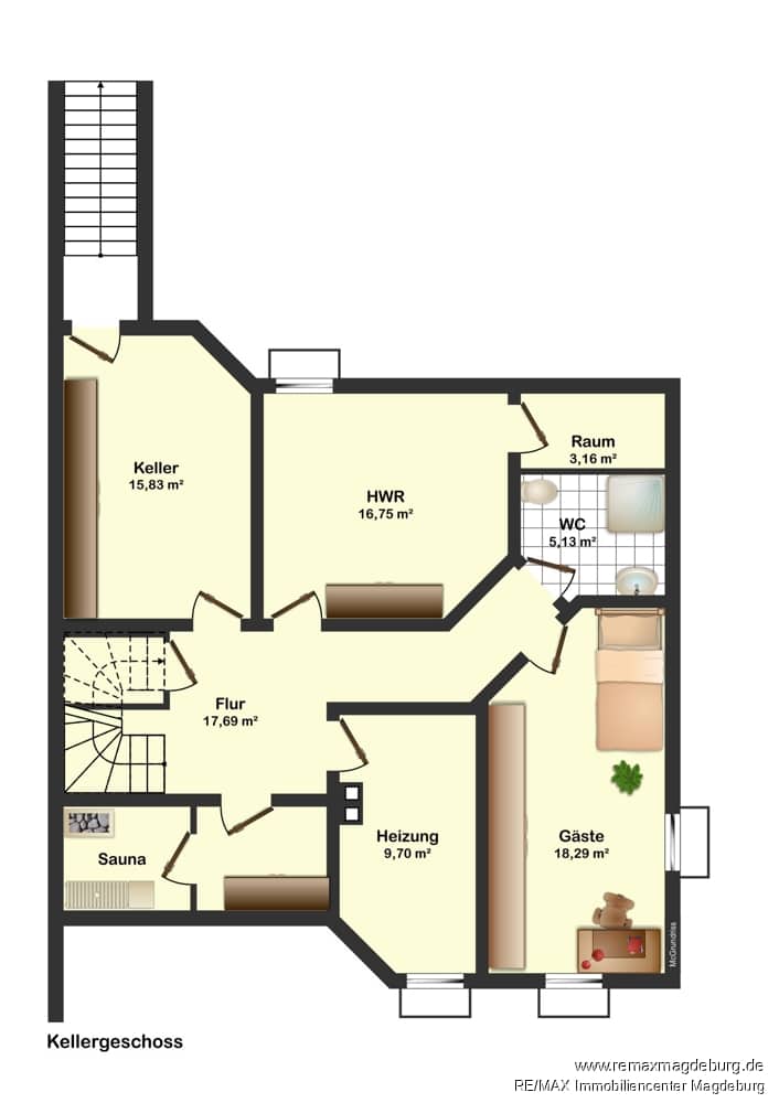 Selbstverständlich ist das Haus voll unterkellert und ausgebaut. Er beherbergt neben mehreren Abstellräumen, einen Raum für Ihre Gäste, eine kleine Wellnessoase mit einer Sauna und Duschbad und sie haben außerdem Zugang in den Garten.