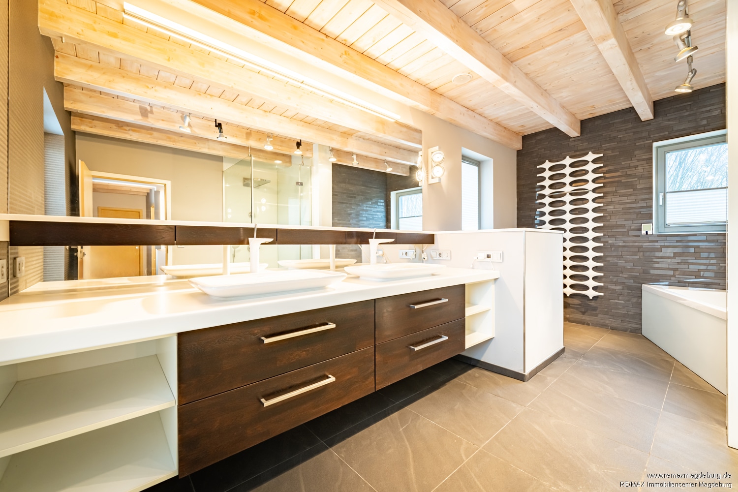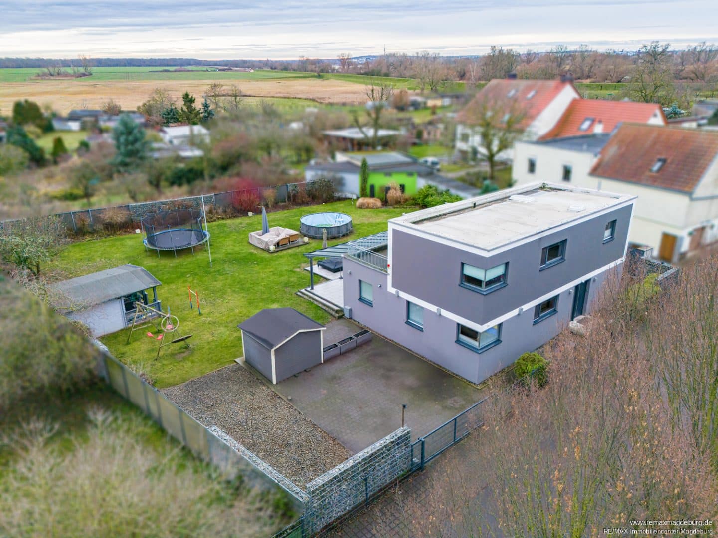 Dieses moderne Einfamilienhaus in Magdeburg-Prester präsentiert sich als ein komfortables und hochwertig ausgestattetes Zuhause in ruhiger und familienfreundlicher Lage. Bereits im Erdgeschoss überzeugt die Immobilie durch einen großzügigen und einladenden Grundriss: Vom Flur aus gelangen Sie in den offenen Wohn- und Küchenbereich, der dank großer Fensterflächen viel Licht bietet und direkten Zugang zur Terrasse ermöglicht. Neben dem Wohnbereich stehen hier ein Badezimmer mit Badewanne und Dusche, ein Hauswirtschaftsraum mit praktischen Einbauschränken sowie drei weitere Zimmer zur Verfügung, die flexibel als Schlafzimmer, Kinderzimmer oder Büro genutzt werden können.