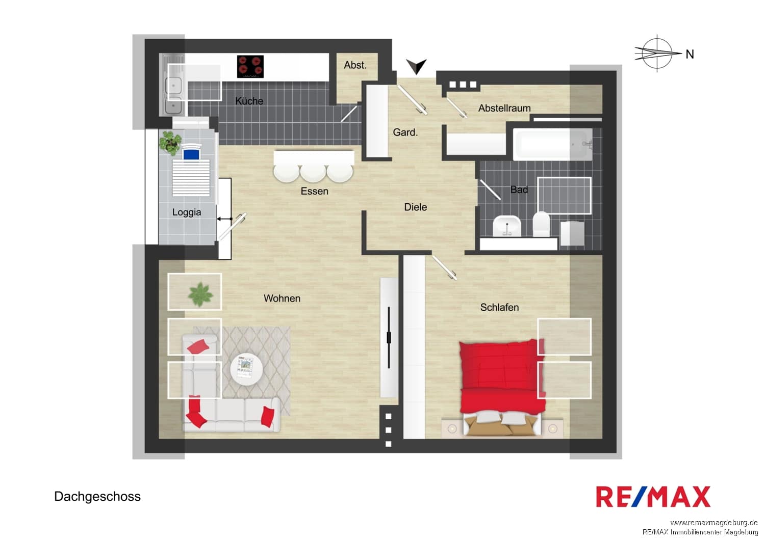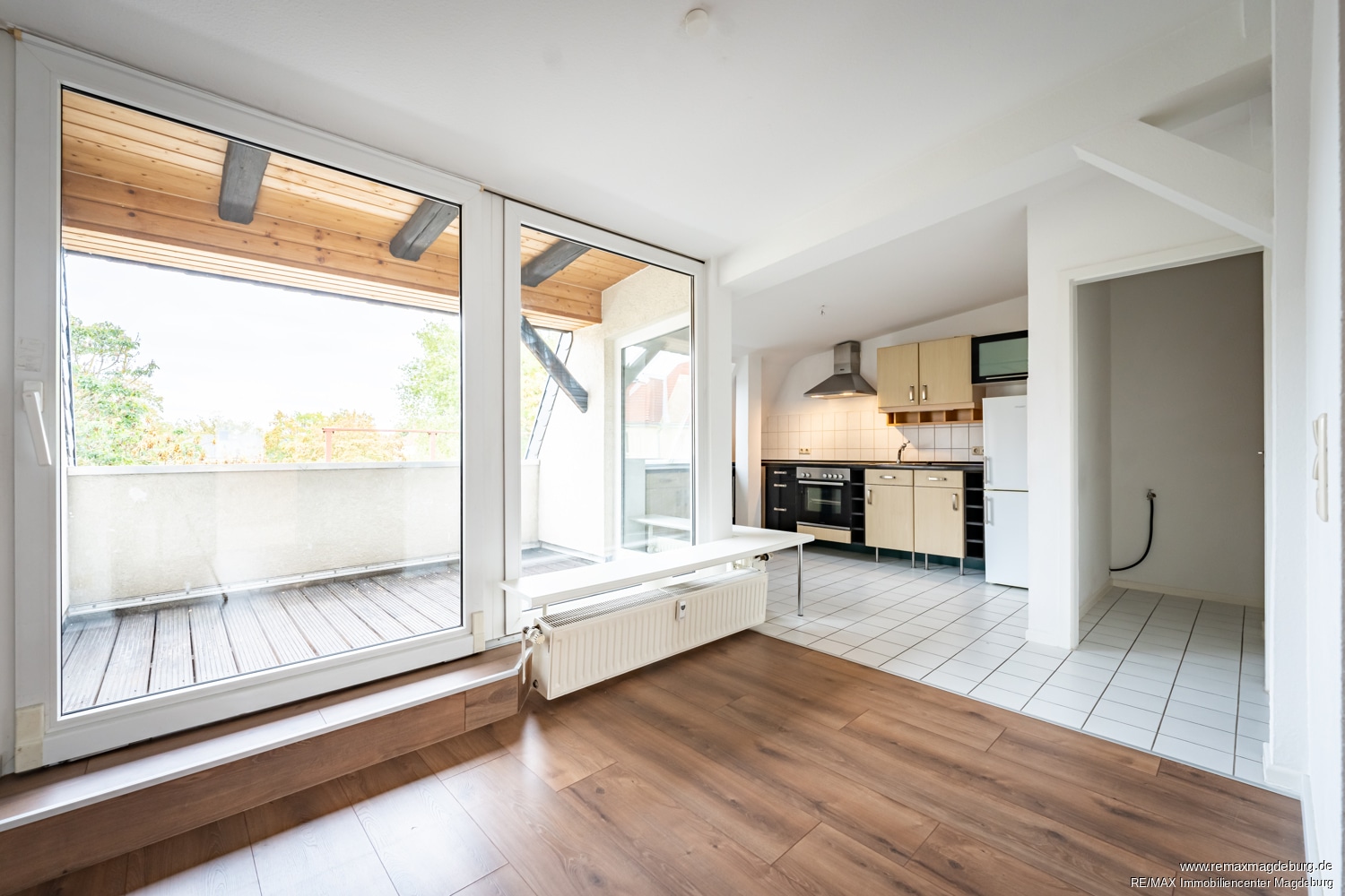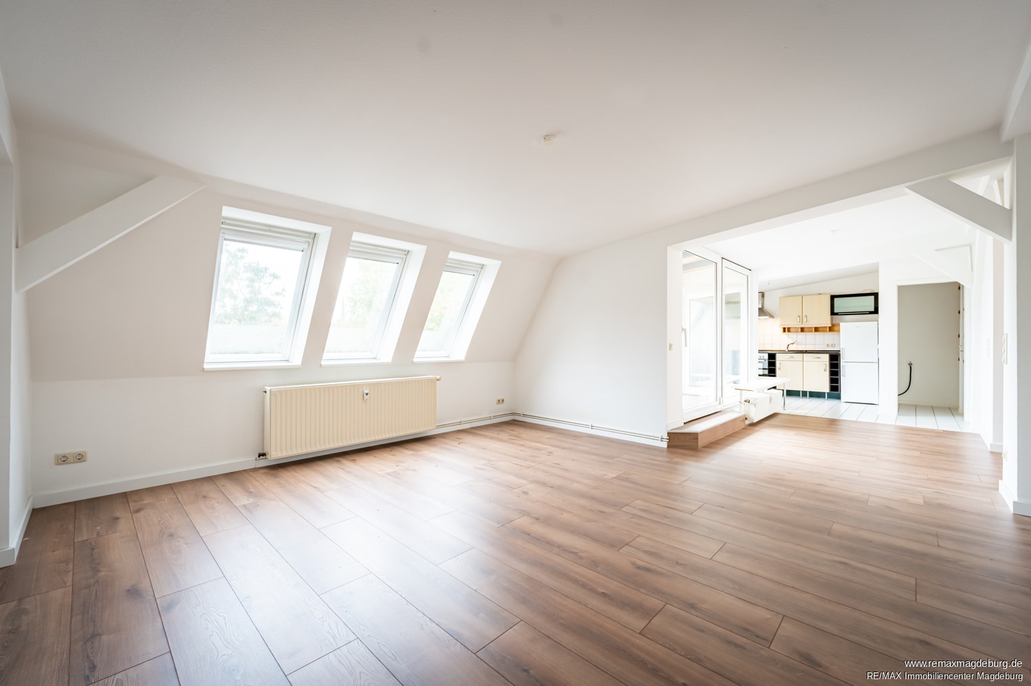 Das Herzstück der Wohnung ist das großzügige, lichtdurchflutete Wohnzimmer mit direktem Zugang zur Loggia. Diese lädt nicht nur zum Entspannen ein, sondern erweitert den Wohnraum ins Freie und verleiht der Wohnung, die im Hinterhaus liegt, eine besondere Qualität. Dank der Lage im Dachgeschoss eines gepflegten Mehrfamilienhauses genießen Sie hier Ruhe und Privatsphäre – mitten in einem der lebendigsten und zugleich grünsten Stadtteile Magdeburgs.