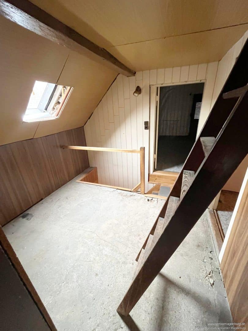Das Dachgeschoss – sanierungsbedürftig mit großem Potenzial. Hier befinden sich drei weitere Zimmer. Dieser Bereich bietet Ihnen die Möglichkeit, zusätzlichen Wohnraum ganz nach Ihren eigenen Vorstellungen zu gestalten und aus- und umzubauen – ob als Rückzugsort, Gästezimmer, Kinderzimmer oder Büro.