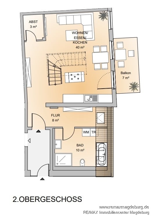 Herzstück der Wohnung ist der offene Wohn-, Koch- und Essbereich, der mit viel Tageslicht für eine freundliche, helle Stimmung sorgt. Von hier aus betreten Sie den sonnigen Balkon, der an warmen Tagen zum idealen Rückzugsort im Freien wird. Ein praktischer Abstellraum rundet diese Ebene ab.