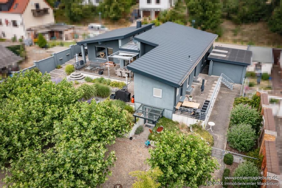 Durch die höher liegende Südterrasse haben Sie einen grandiosen Panoramablick über den toll angelegten Garten. Die Gestaltung der Fassade ist neben der Architektur besonders und lässt das Haus zu einem Blickfang der Straße werden.