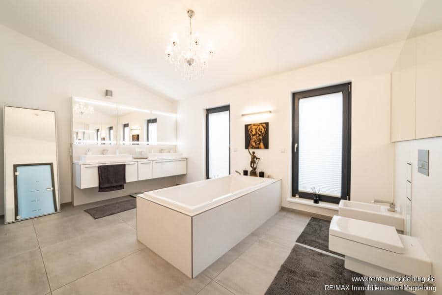 Auf einer Wohnebene wurden zwei Bereiche geschaffen, sodass Eltern und Kind einen eigenen Rückzugsort haben. So umfasst die Ostseite den Elternbereich mit einem opulenten Master-Luxus-Bad mit freistehender Wanne, zwei Designer-Waschtischen, ein separates Duschbad mit extra großer ebenerdiger Glasdusche, das Schlafzimmer mit Ankleide und einem Arbeitszimmer.