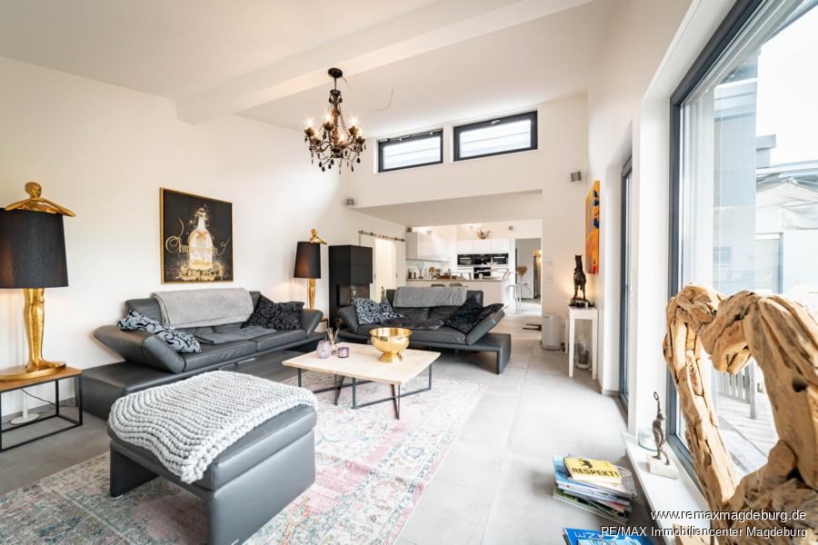 Im Zentrum des Hauses - als Gemeinschaftsbereich, steht die hochwertige offene Küche, die mit dem Wohn- und Essbereich mit Kamin nahezu verschmilzt. Indirekte Beleuchtung in allen Räumen setzt toll Akzente.