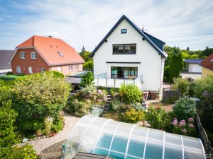 Die Außenanlage ist ein Paradies für Genießer: Ein großer, überdachter Pool lädt das ganze Jahr über zum Schwimmen ein. Der liebevoll gepflegte Garten bietet absolute Privatsphäre und jede Menge Platz zum Entspannen, Spielen und Genießen. Eine Garage mit elektrischem Tor schützt nicht nur Ihr Fahrzeug, sondern bietet auch zusätzlichen Stauraum. Direkt dahinter wartet eine zweite, überdachte Terrasse auf Sie – perfekt für laue Sommerabende oder ein ruhiges Frühstück im Grünen. Eine Regenwasserzisterne sorgt für nachhaltige, kosteneffiziente Gartenbewässerung