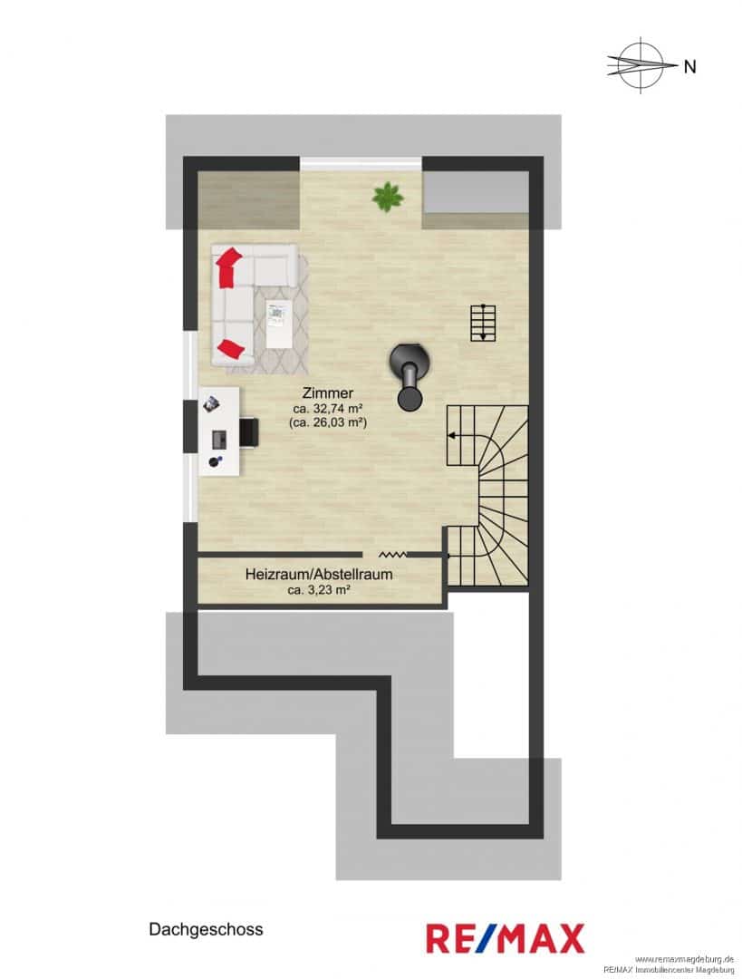 Ergänzt wird das Raumangebot durch den ausgebauten Spitzboden, der bequem über eine Holztreppe erreicht wird und genügend Stauraum und Abstellfläche für die vielen großen und kleinen Dinge des Haushalts bietet.