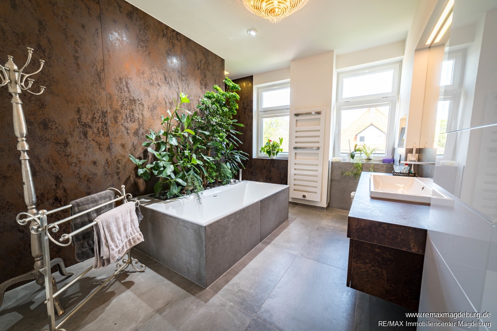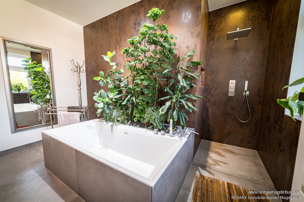 Das Badezimmer mit ebenerdiger Dusche, einer großen Badewanne, edlen Armaturen, geschmackvollen Fliesen und einer Infrarot-Fußbodenheizung sorgen für einen noblen Flair und für das tropische Regenwaldfeeling sorgt die vertikale Pflanzenwand.