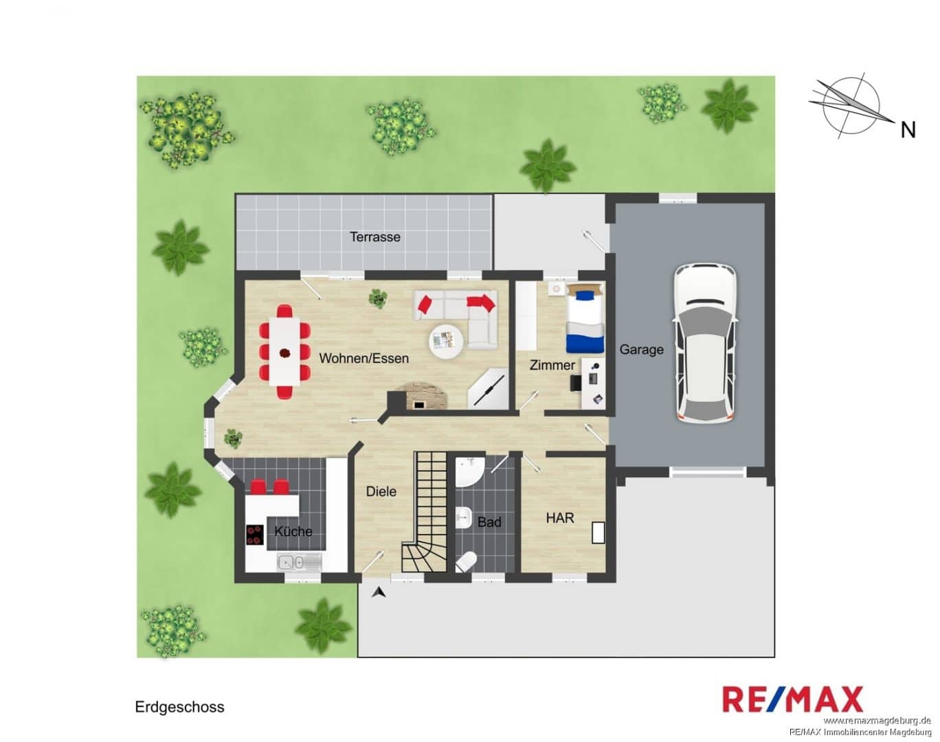 Beim Betreten des Hauses empfängt Sie ein zentral gelegener Flur, von dem aus alle Räume bequem erreichbar sind. Das Herzstück bildet der offen gestaltete Wohn- und Essbereich mit direktem Zugang zur sonnigen Terrasse mit Markise – perfekt für gemütliche Familienabende oder gesellige Stunden mit Freunden.