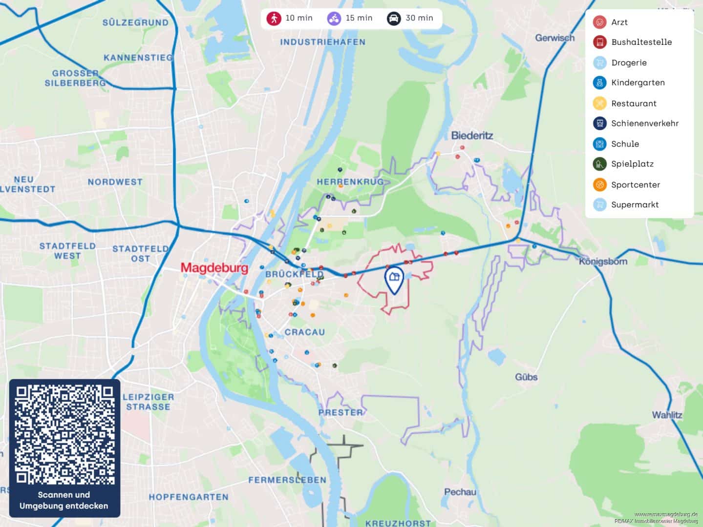 Das Einfamilienhaus befindet sich am Sülzwiesen Privatweg in Magdeburg, einer ruhigen, familienfreundlichen Wohnstraße. Die Umgebung ist geprägt von gepflegten Einfamilienhäusern und viel Grün, was ein angenehmes und sicheres Wohnumfeld schafft.