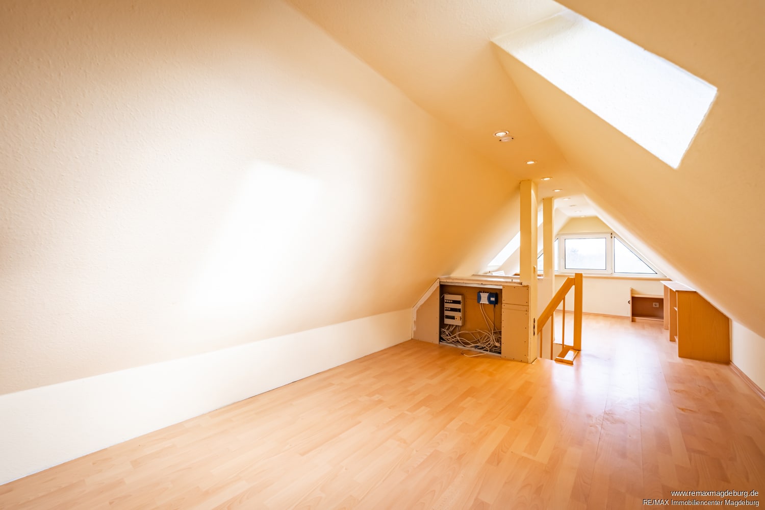 Im Dachgeschoss erwarten Sie ein Tageslichtbad mit Badewanne und Dusche, ein gemütliches Kinderzimmer sowie ein Schlafzimmer mit Zugang zum ausgebauten Spitzboden – ein Rückzugsort mit vielen Nutzungsmöglichkeiten. Ein Balkon erweitert den Wohnraum nach draußen und lädt zu ruhigen Momenten an der frischen Luft ein.