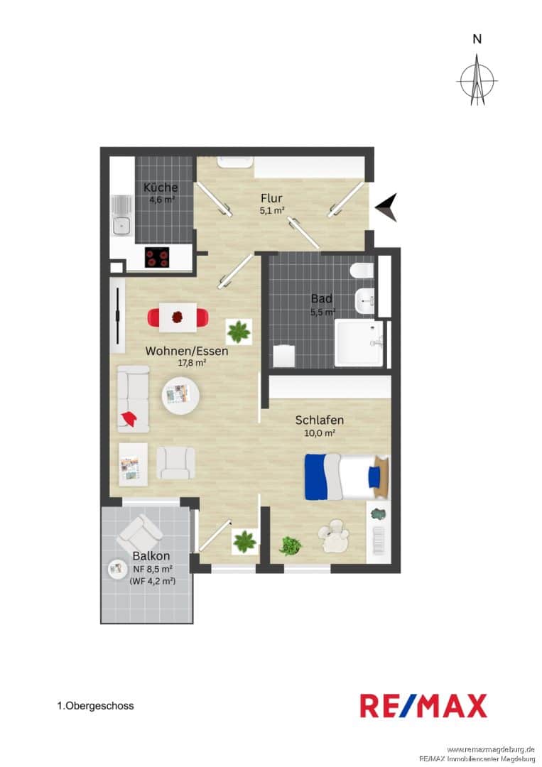 Das helle, großzügige Wohnzimmer mit direktem Zugang zum Balkon schafft eine angenehme Wohnatmosphäre und bietet ausreichend Platz für eine individuelle Möblierung. Das ruhig gelegene Schlafzimmer mit bodentiefem Fenster sorgt für viel Tageslicht und ein behagliches Wohngefühl.
