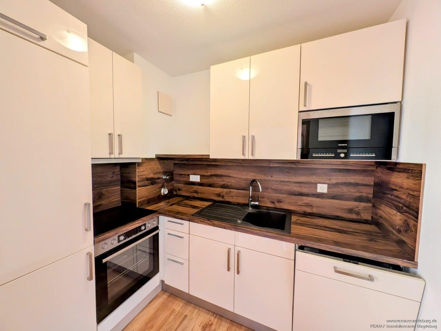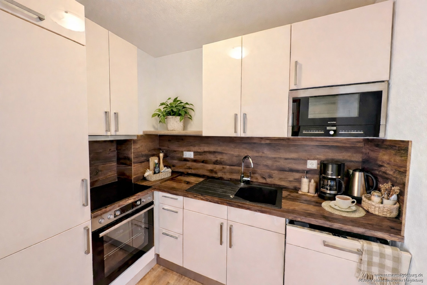Die erneuerte Einbauküche verfügt über eine vollständige, gut zugängliche Ausstattung mit Geschirrspüler, Cerankochfeld mit Backofen, Kühl- und Gefrierkombination, Mikrowelle sowie Spüle und ermöglicht komfortables Kochen im Alltag.