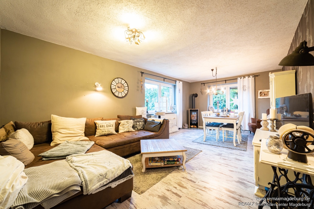 Herz des Hauses ist das gemütliche Wohnzimmer mit Kamin, das einen wundervollen Ausblick in den grünen Garten bietet.