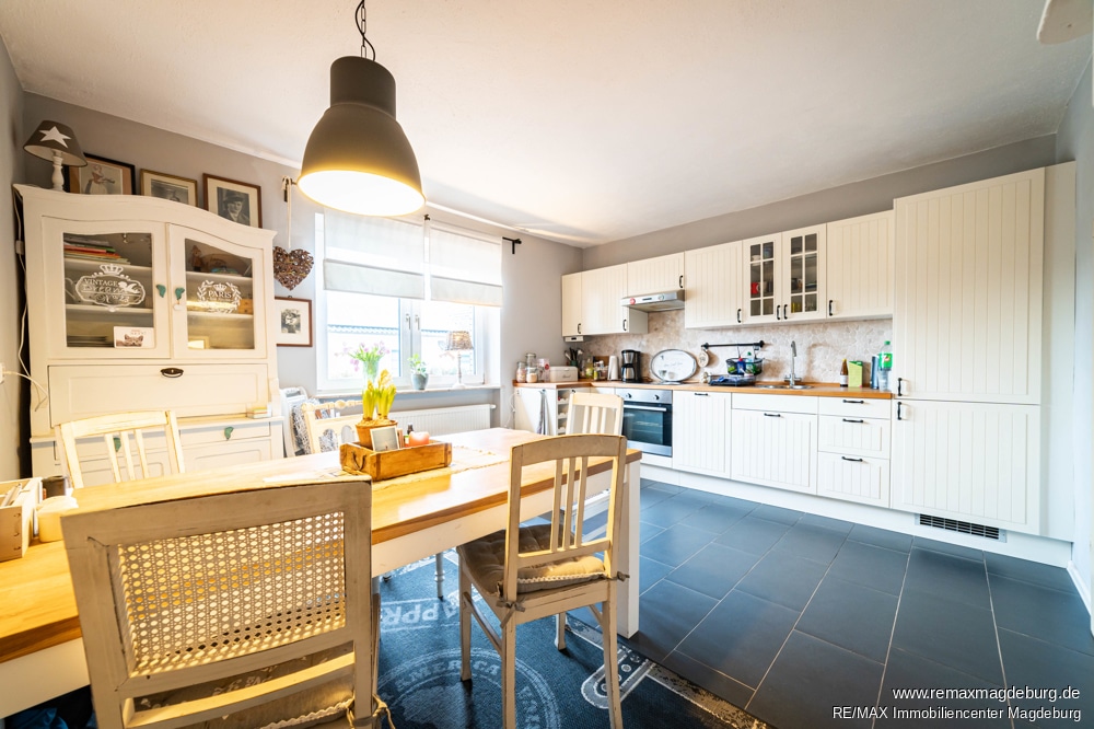Das Erdgeschoss verfügt außerdem über eine Küche, ausgestattet mit einer Einbauküche, ein Tageslichtbad mit einer Dusche und Waschmaschinenanschluss, sowie eine im Haus integrierte Garage.
