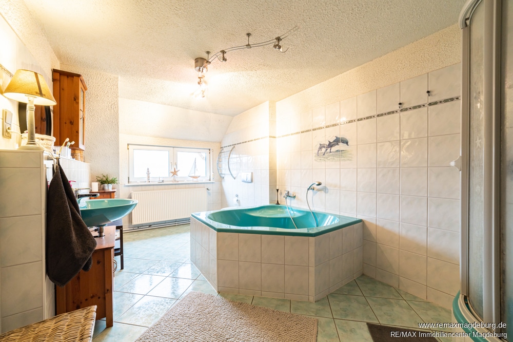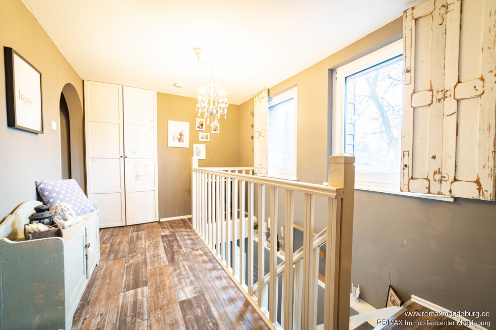 Im Obergeschoss befinden sich neben den zwei Schlafräumen, ein Durchgangszimmer und das Tageslichtbad ausgestattet mit einer Badewanne und Dusche.