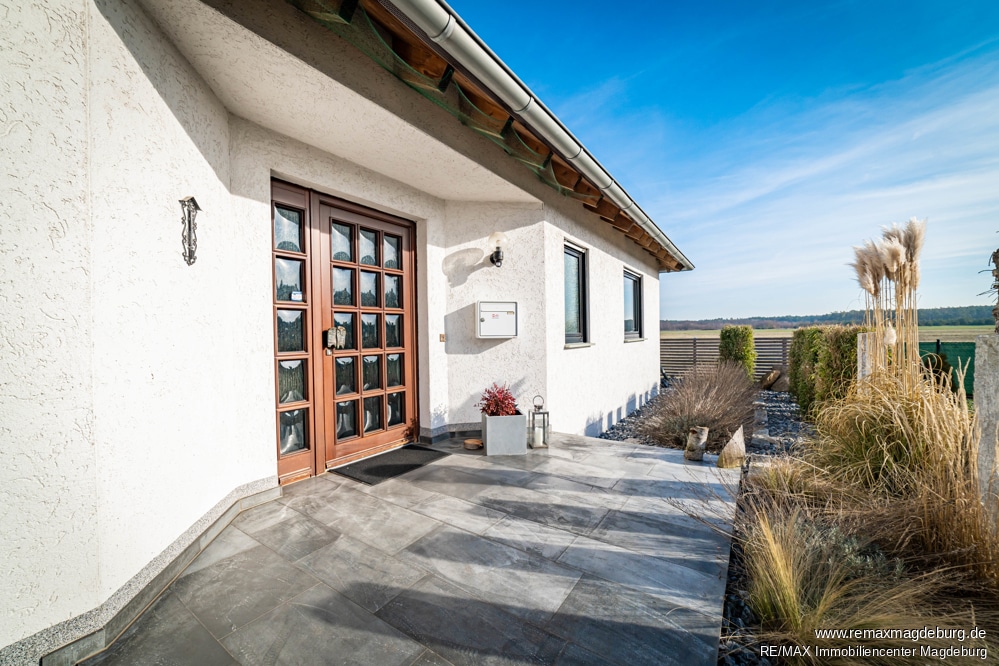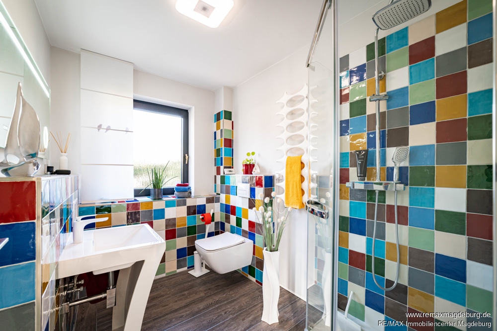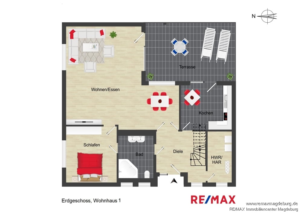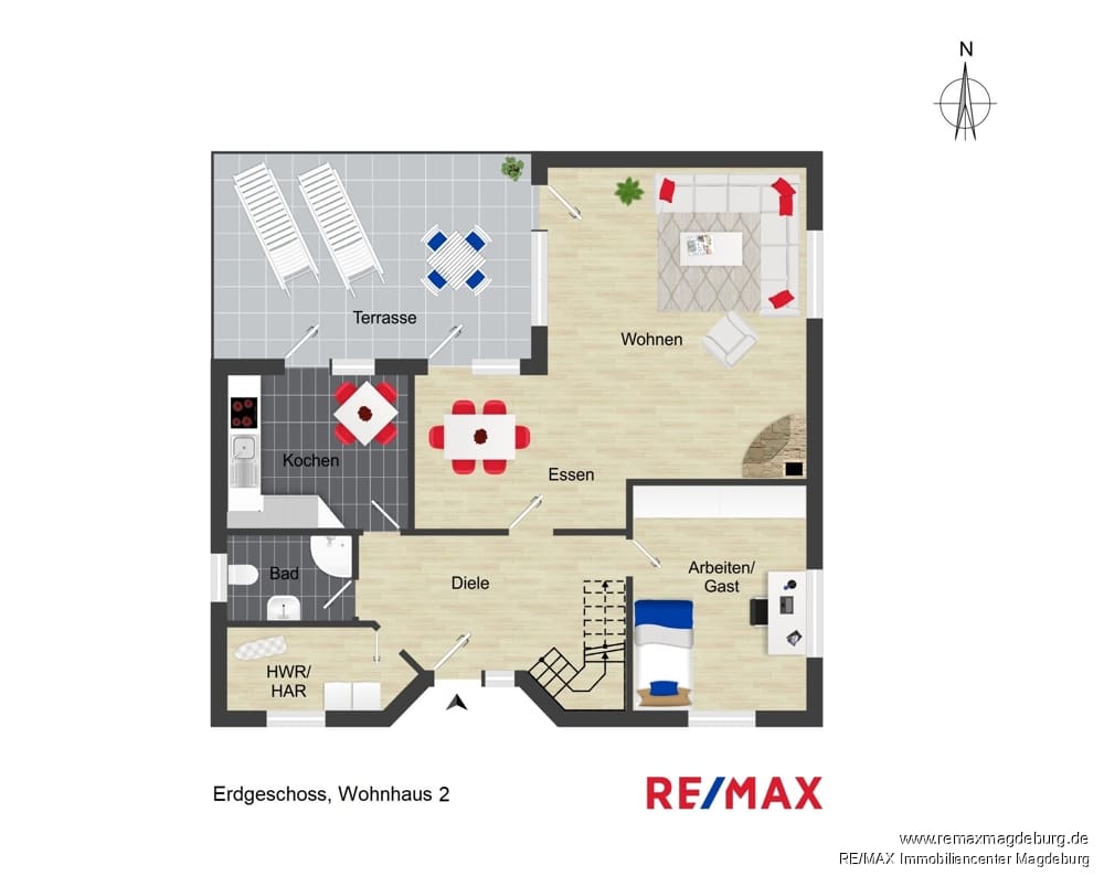 Die Wohnküche mit Einbauküche bietet ebenfalls den Zugang zur Terrasse. Das Erdgeschoss im Wohnhaus 1 hält zusätzlich noch ein Gästezimmer und ein Badezimmer mit Dusche für Sie bereit. Das Wohnhaus 2 bietet hier ein Schlafzimmer mit Zugang zum Badezimmer, welches mit einer Badewanne ausgestattet ist.