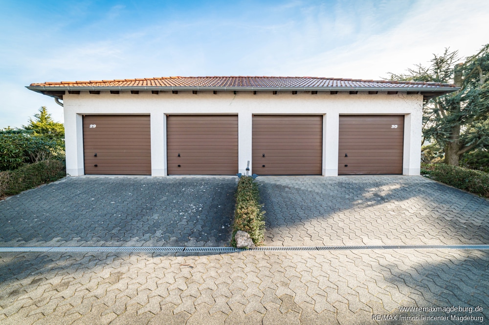 Für eine bequeme Unterbringung Ihrer Fahrzeuge sorgt eine massive Garage mit insgesamt 4 Stellplätzen und elektrischen Rolltoren.