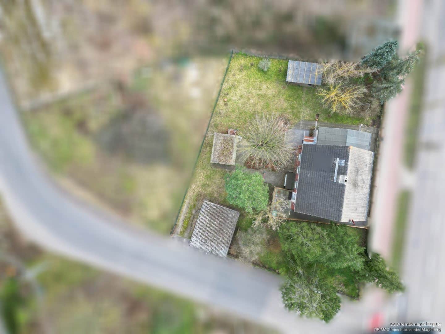 Die Außenanlage umfasst einen Geräteschuppen und zwei Unterstände, wobei einer bei Bedarf zu einem Carport ausbaut werden könnte.