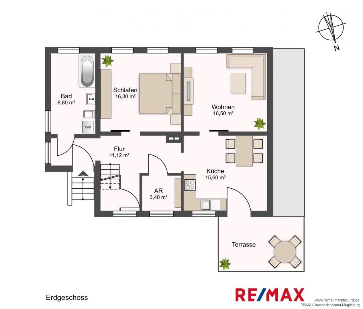 Im Erdgeschoss empfängt Sie ein großzügiger Flur, der zu überwiegend allen Wohnräumen führt. Hier befinden sich ein Tageslichtbad mit Badewanne, ein Schlafzimmer, die Küche und das Wohnzimmer, die gemeinsam den Kern des Hauses bilden. Von der Küche aus gelangen Sie auf die Terrasse, die zum Verweilen im Freien einlädt und den Übergang zwischen Wohnraum und Garten harmonisch gestaltet. Ein praktischer Abstellraum rundet die Ausstattung des Erdgeschosses ab.